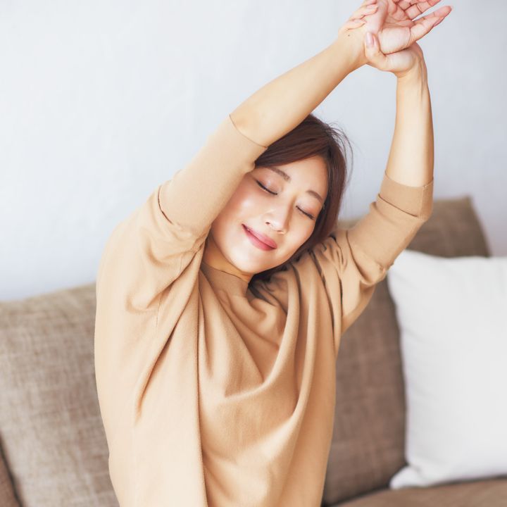 脇下側面が硬いと背中も胸も開きにくく丸い背中になるので、伸ばすようにしています。右手を上にあげて左斜め前にぐっと引っ張られるように伸ばします。反対も同様に。フォームローラーでゴロゴロやっても◎。