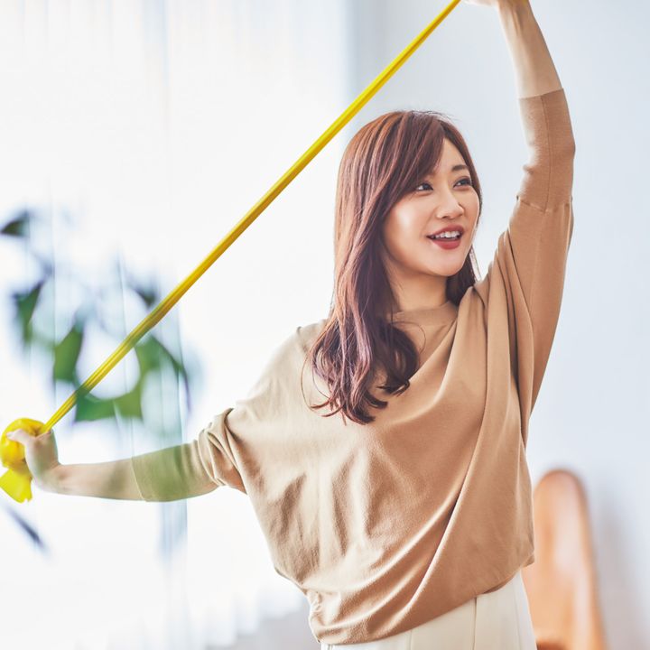 ジムのトレーナーさんに勧められたセラバンドは強度が低い黄色を愛用。両手で持って張りを感じる長さに握り、体の周りでグルグル回したり背中で上げ下げします。軽いのでバッグに入れて携帯し、暇さえあればやります。