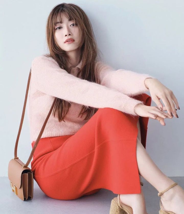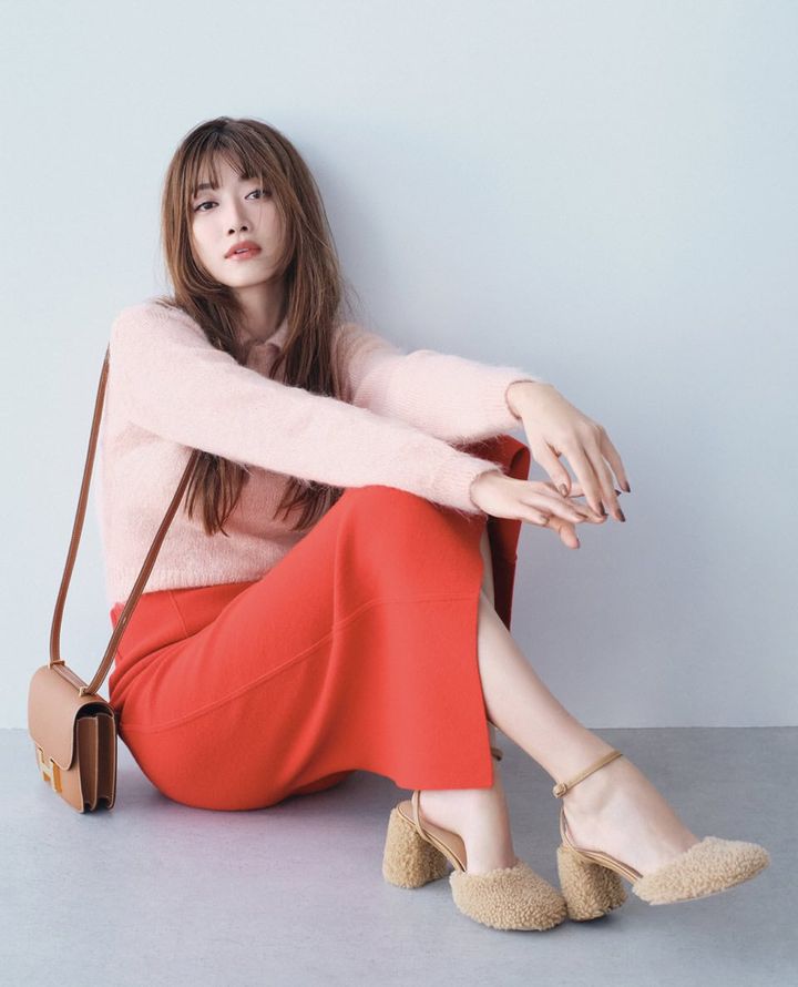 「それぞれ別々のセレクトショップで購入したんだけど、どちらもAURALEEだった! ポロニットはいちごミルクみたいなピンクに一目惚れ♡ 冬は色が着たくなるみたいで、スカートも珍しく赤をセレクト。この色合わせがめちゃくちゃ気に入っています」