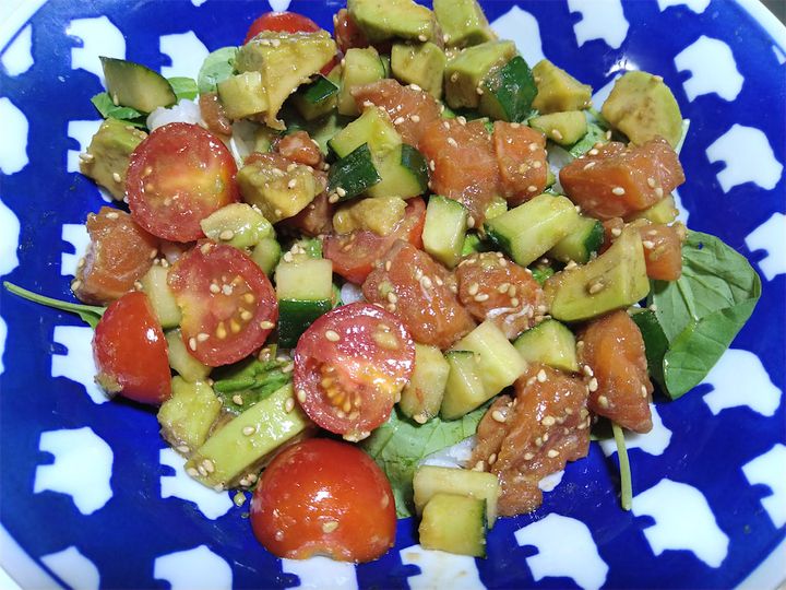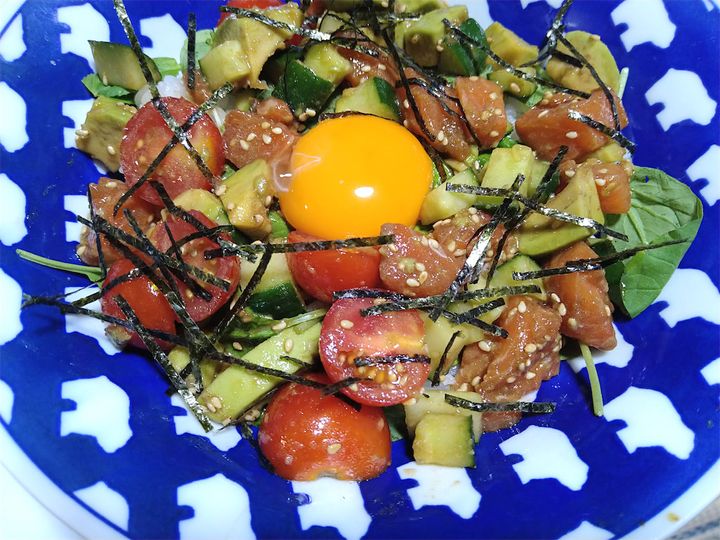 「ポキ丼」の主役とも言えるサーモンとアボカドの組み合わせはもちろんおいしいですが、そこにきゅうりのシャキシャキ食感とミニトマトのジューシーさが加わることで、サッパリいただけます♪