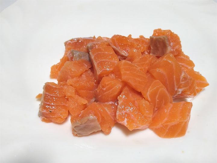 3. サーモンは大きめの角切りにする。