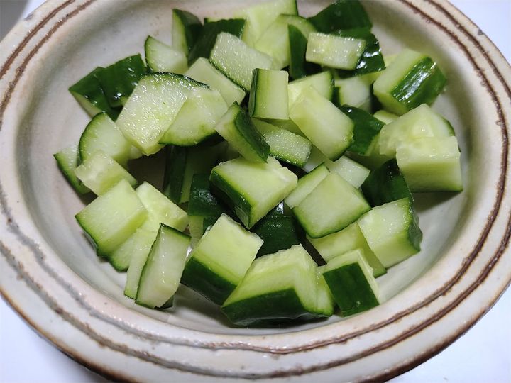 1. きゅうりを洗い、塩(分量外)で板ずりしてサイコロ状に切る。ミニトマトはヘタを取り、半分に切る。