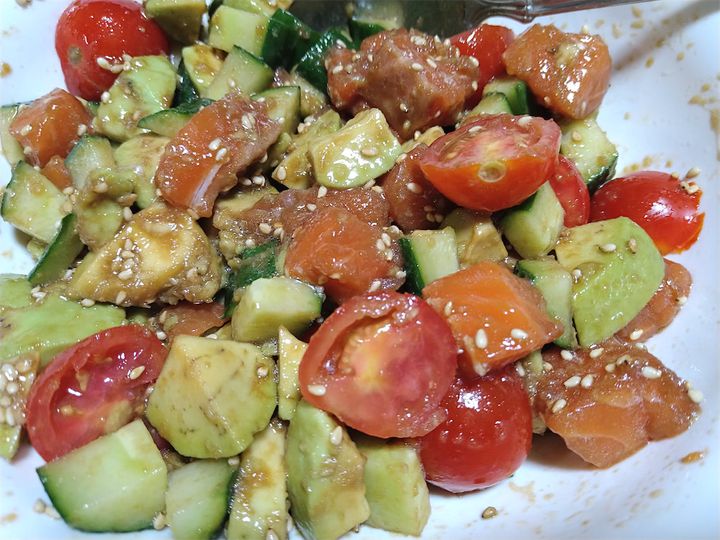 4. ボウルにしょうゆ、ゴマ油、にんにく、白いりゴマをよく混ぜ合わせたら、きゅうり、トマト、アボカド、サーモンを入れて馴染むまで混ぜる。
