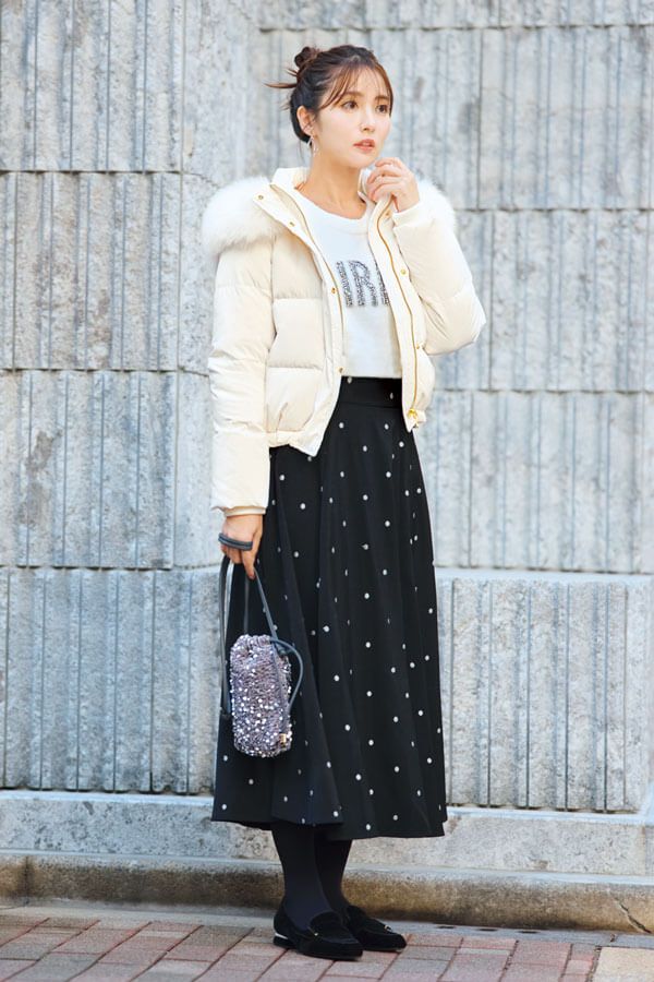 ダウンコート¥32,890/WILLSELECTION(WILLSELECTION ルミネエスト 新宿店) ニット¥18,700/アプワイザ ー・リッシェ スカート¥15,400/Noëla バッグ¥4,950/カシュカシュ(アンビリオン) イヤリング¥38,500/ケンゴ クマ プラス マユ(ヴァンドームヤマダ) タイツ¥1,320/靴下屋(Tabio) ローファー¥10,890/RANDA