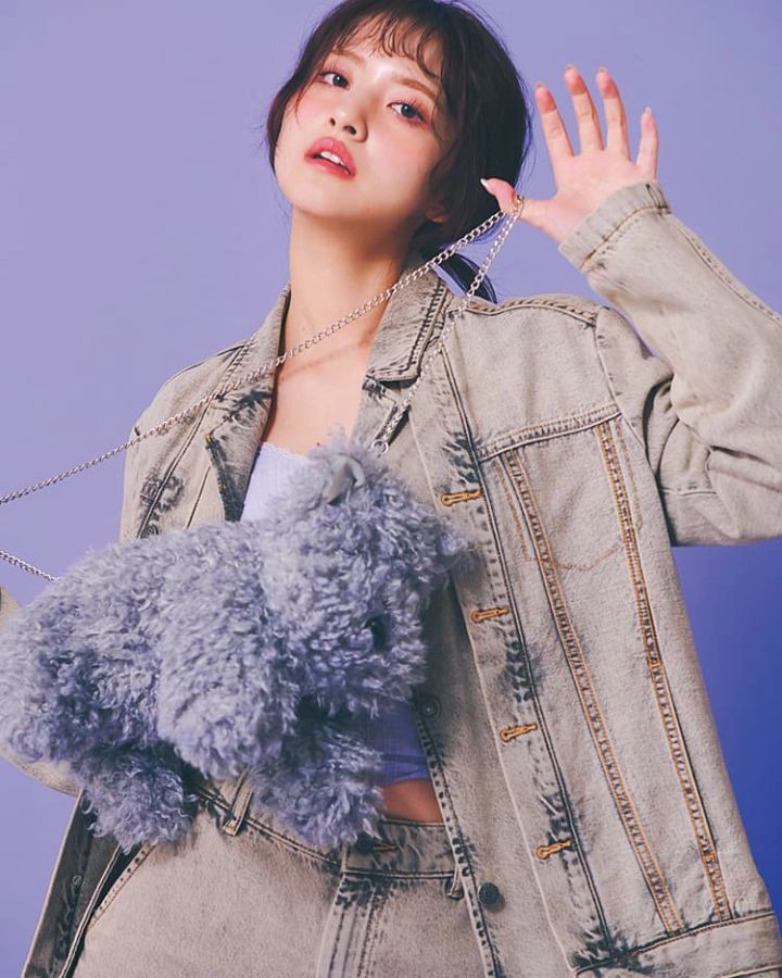 ファーぬいぐるみショルダーバッグ 3,299円/W♥C デニムジャケット 43,900円、デニムパンツ 19,900円/ともにデシグアル(デシグアル ストア 銀座中央通店)パープルキャミソール 2,108円//WEGO