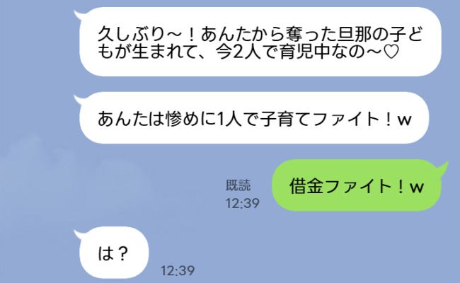 略奪女から嫌味連絡「実は出産して今2人で育児中なの♡あんたは1人で子育てファイト!」私「借金ファイト!」略奪女の末路は