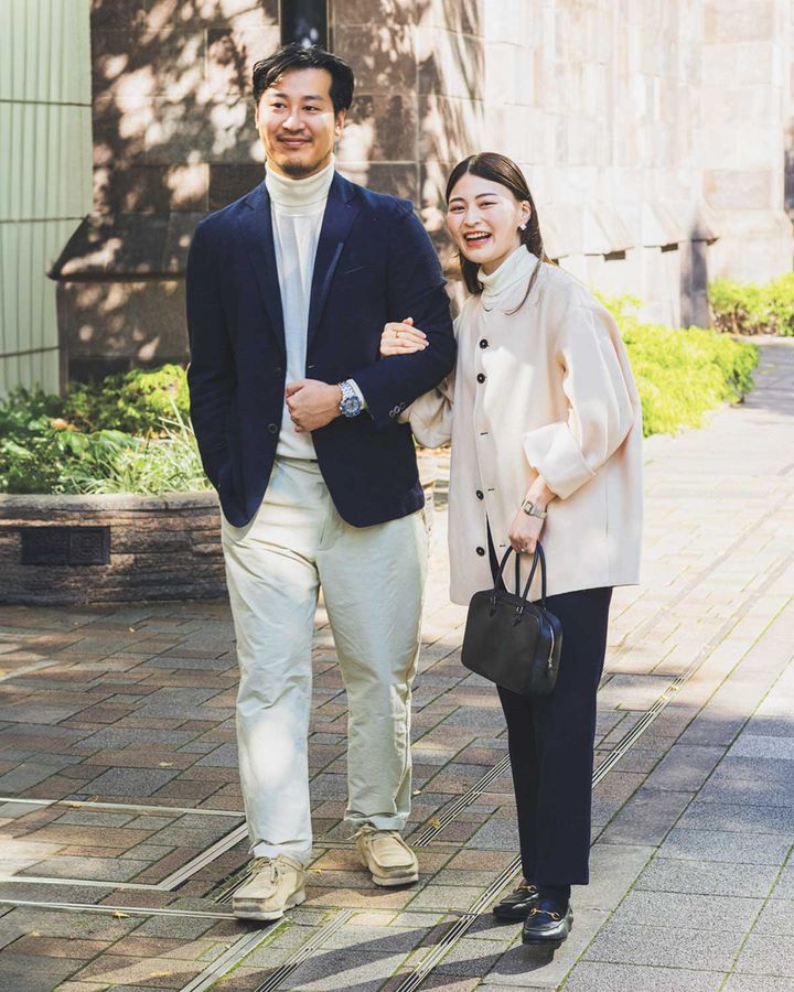 ホコ天で歩きやすいから、週末ショッピングは銀座が定番。妻はMarniのデニムジャケット、夫はTOMMY HILFIGER GOLFのハーフジップトップスでカジュアルをMIXした着こなしも、時計の存在感で大人に。銀座でチェックするのは三越、GINZA SIX、CABaN。ランチは銀座まつもとのハンバーグが鉄板。