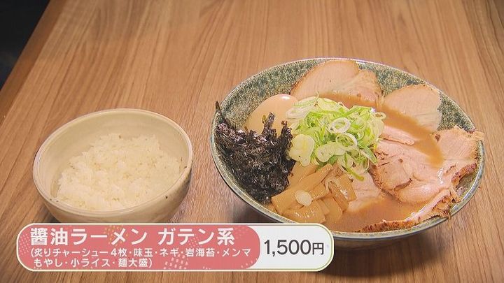 炙りチャーシュー4枚に味玉、ネギ、岩ノリ、水菜、メンマ、もやし、麺大盛、小ライスが付いて1,500円!コスパ最強です!
