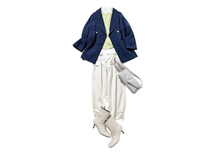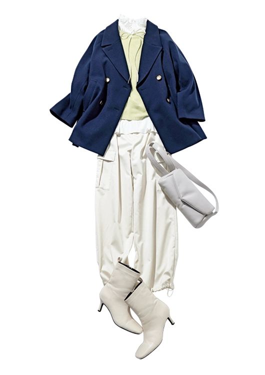 ピーコート¥12,980/グローバルワーク(アダストリア) ギャザーブラウス¥8,990/アンフィーロ(オンワード樫山) ジャンスカセット(ニット)¥15,994/NATURAL BEAUTY BASIC カーゴパンツ¥22,000/Stola. ロール型ショルダーバッグ¥8,800/カカトゥ(アンビリオン) ショートブーツ¥2,420/神戸レタス