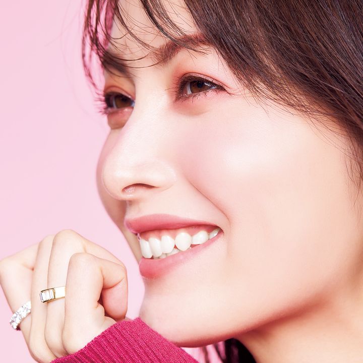 〈衣装クレジット〉ニット¥5,500(エルーラ/アダストリア)ピアス¥9,990人差し指リング¥44,000薬指リング¥24,300(すべてアビステ)