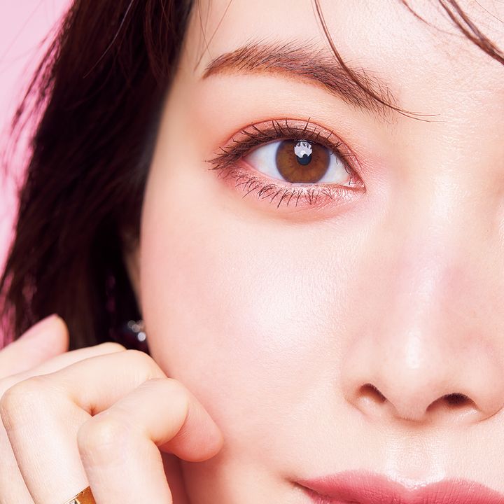 強い発色のピンクより柔らかい方が大人にはチャレンジしやすく、若々しい印象に。アイシャドウ、チーク、リップはワントーンにすることで統一感が出て、こなれ感が出るのでおすすめ!アイシャドウはあえて締め色のないパレットで抜け感を、チークはくすみ系のコーラルで、頰だけではなく鼻筋にものせればより一体感が。リップは少しオーバーにのせて、エイジングによる萎みもカバー。