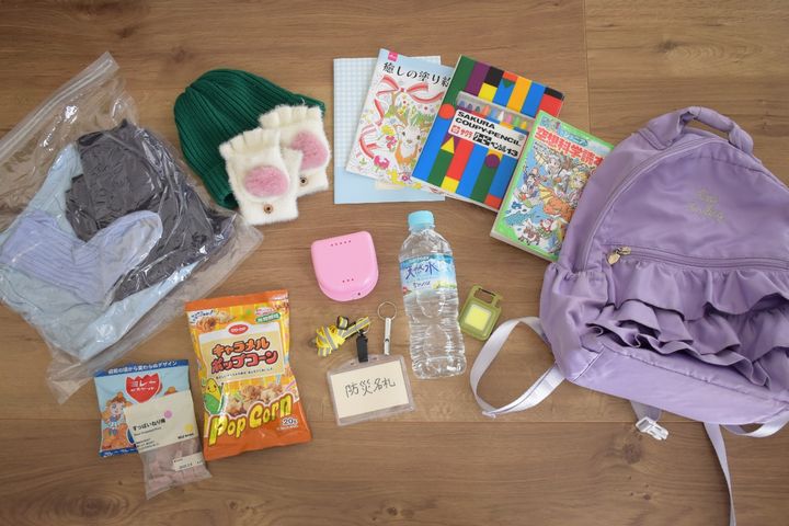 ボディウォッシュなどの洗面用具や救急セットなど家族で使う物は大人が持つから、着替えやお菓子、おもちゃは自分の持ち出し袋に入れてほしいとお願いしました。