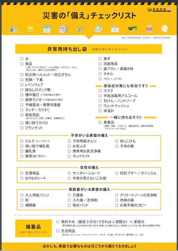 つぎに、一般的な持ち出し袋にはどんなものが入っているのかを見てみました。使ったリストはこちらです。