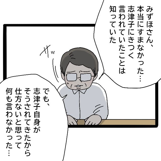 「みずほさん、本当にすまなかった・・・。志津子にきつく言われていたことは知っていた。でも、志津子自身がそうされてきたから仕方ないと思って何も言わなかった・・・」お父さんはそう言ってみずほさんに頭を下げました。