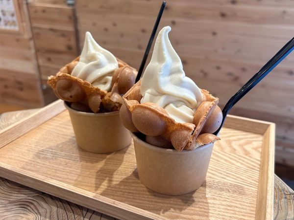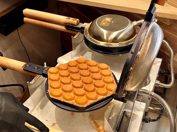 この形のワッフルはバブルワッフルと言われていて、香港発祥だそうです。写真で見えているのは裏側で、表側はもっとぽっこりと丸いのでなんだかたこ焼き器のようにも見えましたよ。