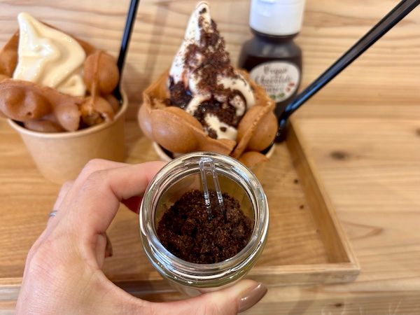 このポコポコの中は空洞があるのでサクッとした食感になっています。だからソフトクリームと合わせても、べちゃっとならずにずっとサクサク。米粉特有のもちもち感も感じられて、どんどん食べちゃう!豆乳ソフトも濃厚なのに甘すぎないのでとても軽くぺろっといけちゃうんです♡実はこの日、オーナーさんが撮影のためにひとつ余分に焼いてくださったのですが、1人で2つ全部食べちゃいました、うふふ。