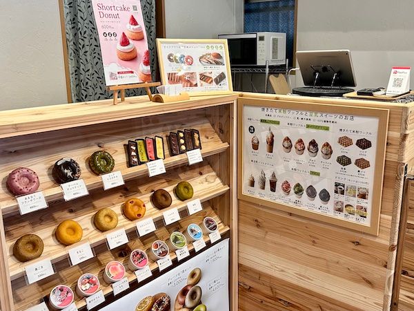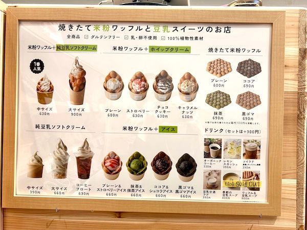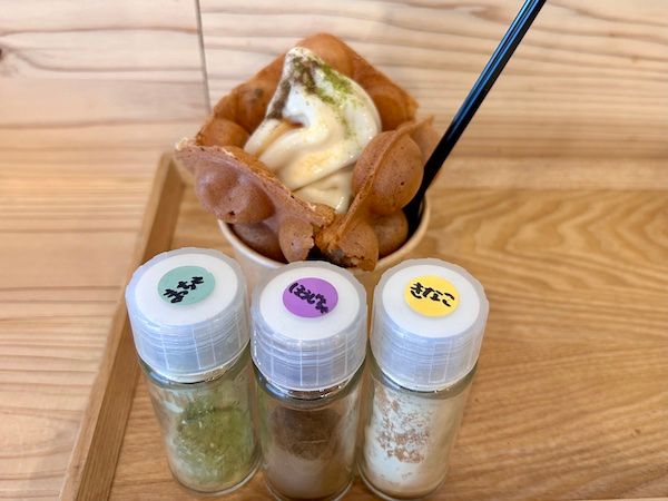 焼きドーナツ、米粉ジェラート、豆乳ソフトなどいろいろありますが、全てのメニュー、イートインはもちろんテイクアウトも可能です。この日は、一番人気のワッフルソフトの中サイズをいただくことにしました。