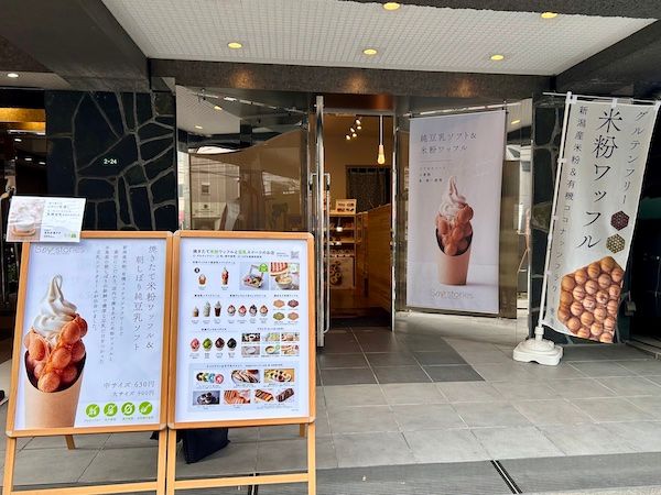 純豆乳のソフトクリームを、注文を受けてから目の前で焼いてくれる米粉ワッフルでクルッと包んだ可愛らしいソフトです!