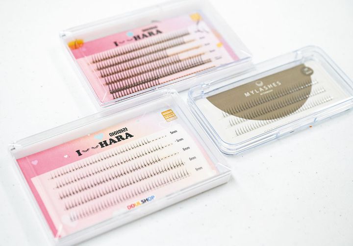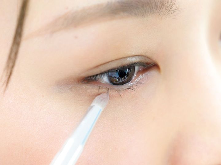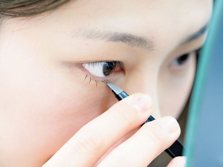 年齢を重ねると、たるみが原因で顔が伸びたように見えるんです。中顔面を短縮させるには、下まつ毛を長く見せ、オーバーリップにするのがポイントです。下まつ毛用のつけまつ毛は、撮影するときなど必須アイテム。長さは5ミリか6ミリの極細タイプを5本使って丁寧につけていきます。ちなみに上まつ毛は10ミリのブラウンを5〜6本まつ毛の間に埋めていきます。