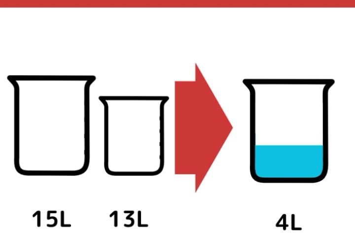 水がちょうど4L入る容器が手元にありません。15Lと13Lの容器を使って、ちょうど4Lの水を計る方法を考えてください。