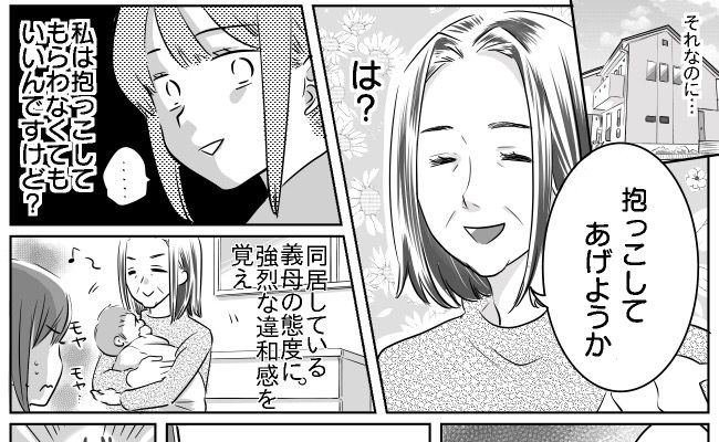 幸せな里帰りも終わり、自宅に戻った私。わが家は義実家完全同居のため、義理の家族と一緒に過ごす日々が始まりました。最初は初孫の誕生を歓迎し、喜んでくれる義両親に幸せな気持ちでいっぱいになりましたが、義母の「抱っこしてあげようか?」このひと言で私の中の友好的な気持ちが一気に瓦解していきました。