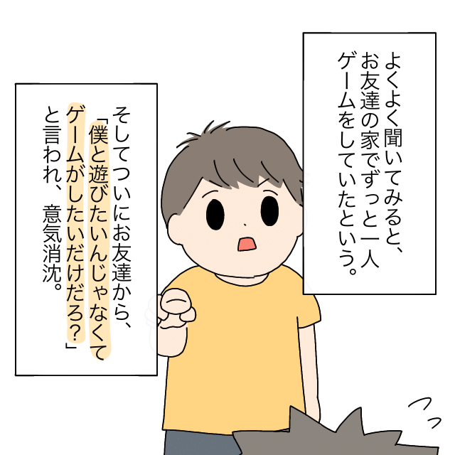 友達の家から落ち込んで帰って来たタクくん、なかなか話そうとしなかったものの、根気よく話を聞いてみると、なんと友達の家で、ずっとひとりでゲームをしていたのでした。そしてついに、「僕と遊びたいんじゃなくて、ゲームがしたいだけだろ?」と友達に図星なことを言われ意気消沈したのでした。