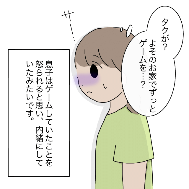 それを聞いた翠さんは、「タクが?よそのお家でずっとゲームを・・?」と衝撃で青ざめてしまいました。タクくんは、ゲームしていたことを知られたら怒られると思い、親には内緒にしていたのでした。