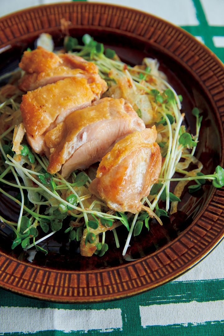上記「チキンソテー」の作り方(1)~(3)を参照し、同様に作る。玉ねぎはあればスライサーで横にごく薄切りにし、水に5分ほどさらして水けを絞る。貝割れ菜は根元を切り落とす。ともにボールに入れ、削り節をまぶし、しょうゆを加えてあえる。器に盛り、チキンソテーを食べやすく切ってのせる。