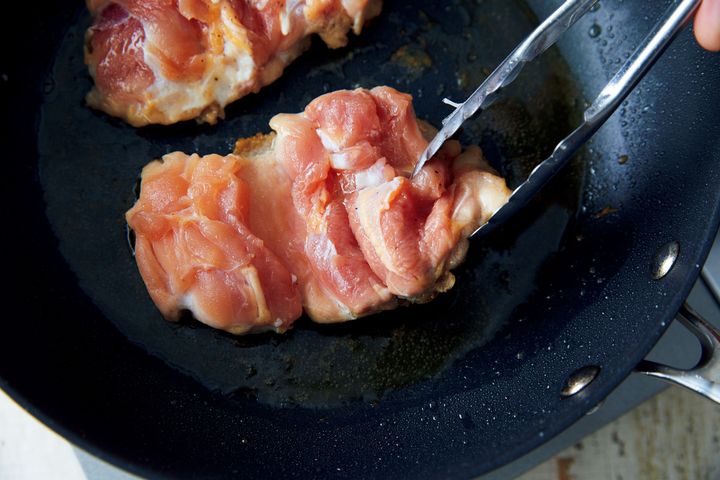 (3)鶏肉の皮目に七分通り火が通るまで、7~8分焼く。余分な脂をペーパータオルで拭き取り、上下を返してさらに2~3分焼く。皮目の焼き色がたりなければ、強火にして好みの焼き色に仕上げる。