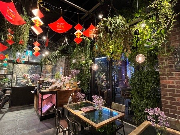 一歩足を踏み入れると、お花畑に来たような素敵な空間が広がっていました。慌ただしい都会の喧騒を忘れさせてくれる、温かみを感じる空間です。花農家の温室をイメージしているそうです。