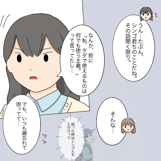 飲み会や彼氏と会う時に預ける先・・。カイトくんママからナオキくんママの言葉を聞いて驚くママ。すると、「うん・・たぶん、シンゴくんちのことだよね、その話聞く限り」とカイトくんママが言い、「そんな・・」ママは絶望的な気分に。「なんか、前に『私、タダで使えるものは何でも使う主義』って言ってたし・・」とカイトくんママのダメ押しが。「でも、いつもナオキくん鍵忘れて困ってて・・」とママ。