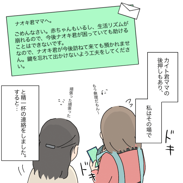 その後、カイトくんママの後押しもあって、その場でメッセージを送ることに。「ナオキくんママへ。 ごめんなさい。赤ちゃんもいるし、生活リズムが崩れるので、今後ナオキくんが困っていても助けることはできないです。なので、ナオキくんが今後訪ねて来ても預かれません。鍵を忘れて出かけないよう工夫をしてください」と精一杯の連絡をしたのでした。