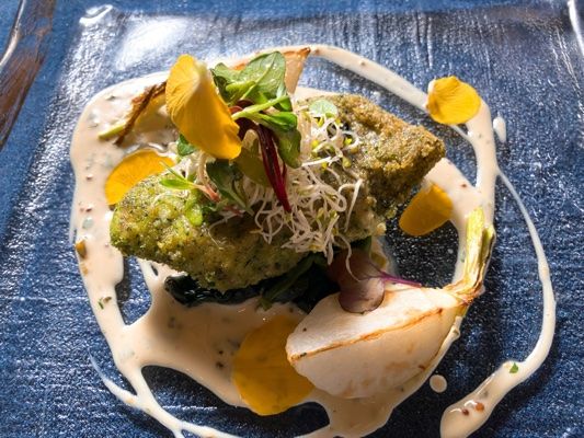 本日の地魚(コチorスズキ)のパネグリル かぶのソテーとほうれん草 ハーブとマスタード白ワインソース