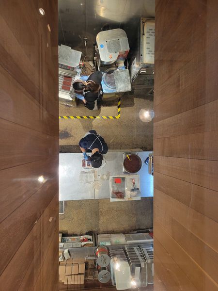 カフェ併設の蔵前店では、2階の席から工房を眺めることができます。丁寧な仕事を感じられました。
