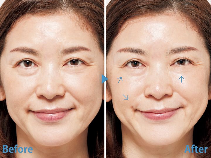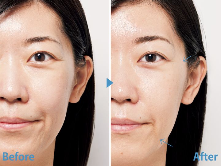 目元にハリが出て、微笑んだ時の目尻のシワが短く。口角下のシワが目立たなくなり、肌の凸凹がつるんと整い滑らかになり、ツヤが出ました。