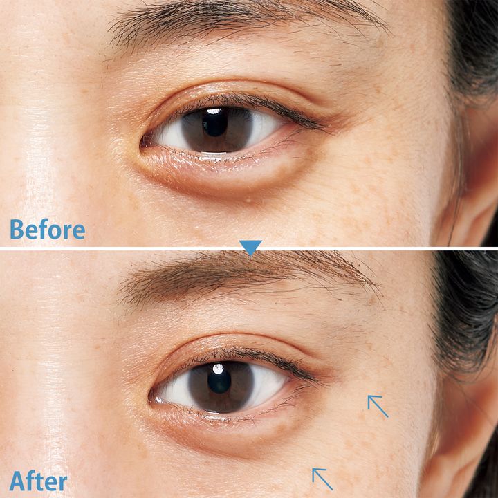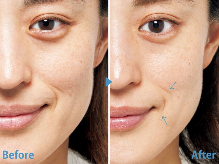 左目の下のくぼみシワがふっくらして影が少なくなり、右目の下の小ジワの重なりも、目立たなくなりました。右側のほうれい線も薄く短くなっています。