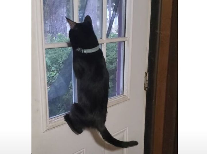 3. お客さん、まだ? ドアにピタッと張り付いて待つ黒猫さん