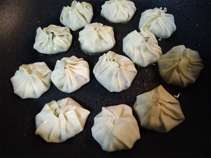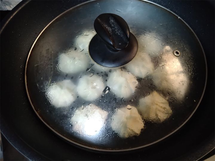 7. フライパンにゴマ油をひき、6を並べたらフタをして焼く。
