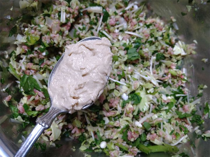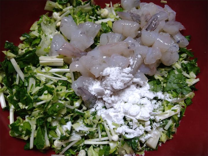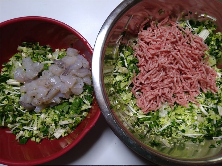 3. ボウルに1のキャベツ、ほうれん草、長ねぎ、2のえのきを入れて混ぜる。これを2等分し、それそれのボウルに小エビと豚ひき肉を分けて入れ、2種類のタネを作る。