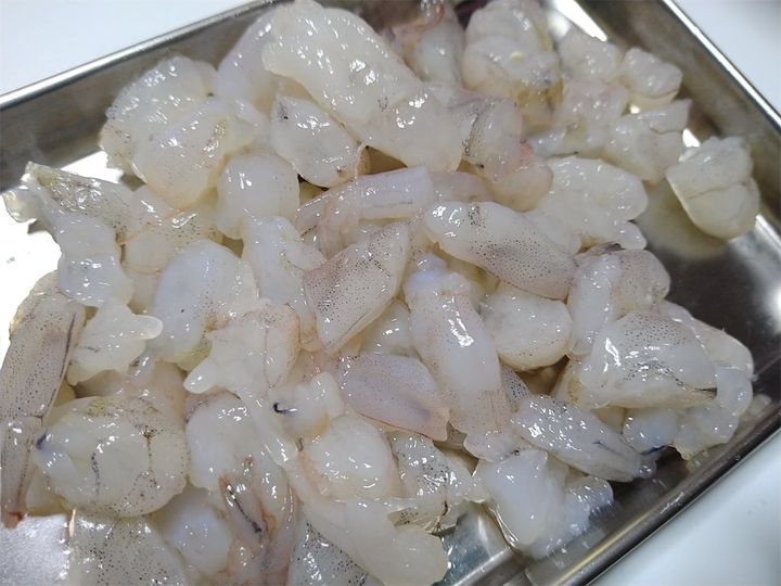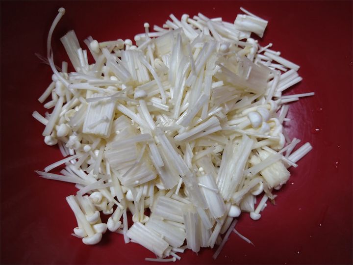 2. えのきは石づき部分を切り落とし、1cm幅程度に切る。小エビも1cm幅程度に切る。