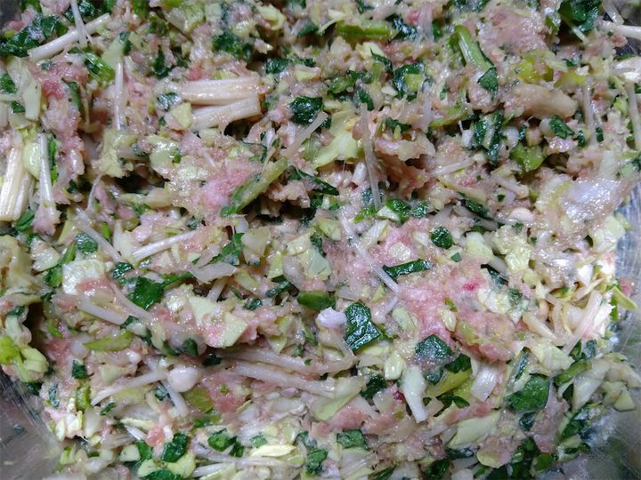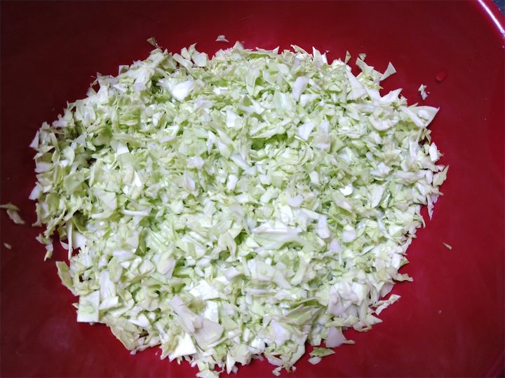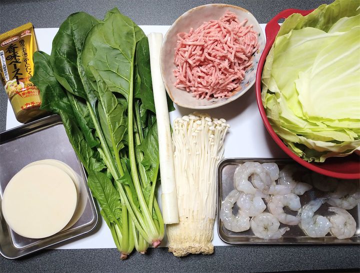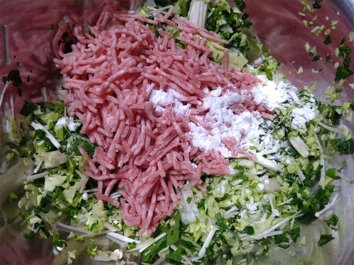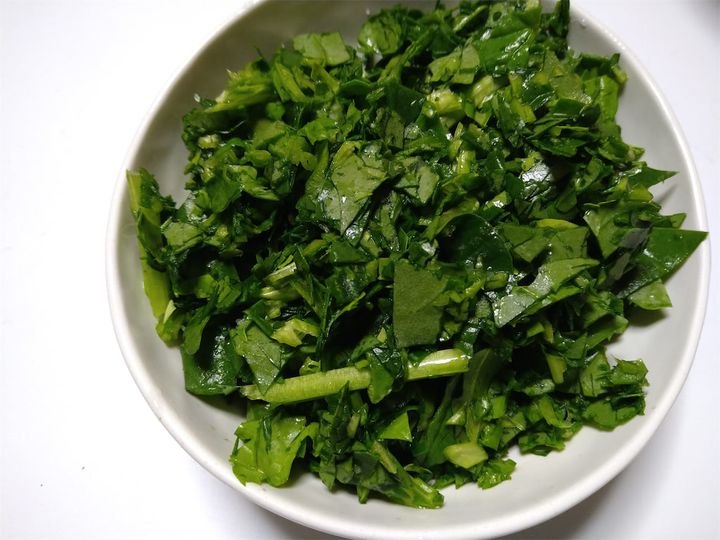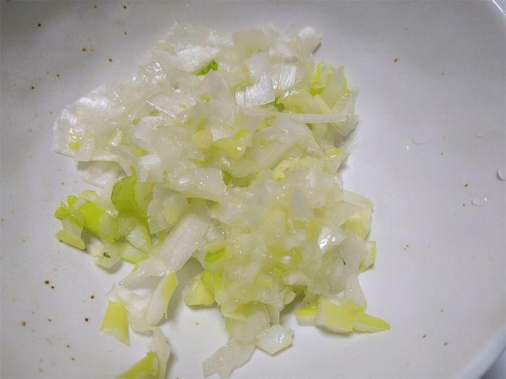1. キャベツ、ほうれん草、長ねぎを粗みじん切りにする。