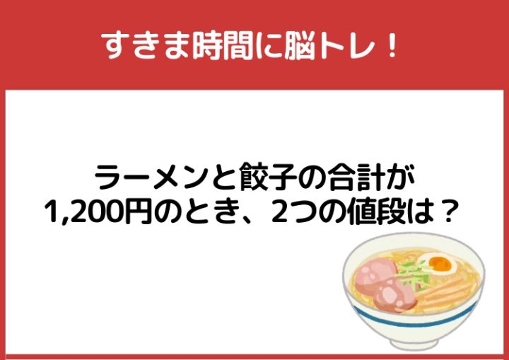 3. すきま時間に脳トレ!「ラーメンと餃子の合計が1,200円のときの2つの値段」は?