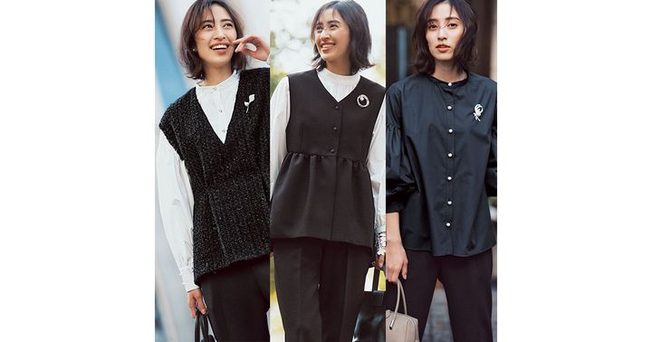 ジレ¥19,800ブラウス¥16,500パンツ¥17,600(すべてスリースクエア)ブローチ¥5,280ピアス[ネックレスとセット販売]¥3,850~バッグ¥19,800(すべてVS セレクション)