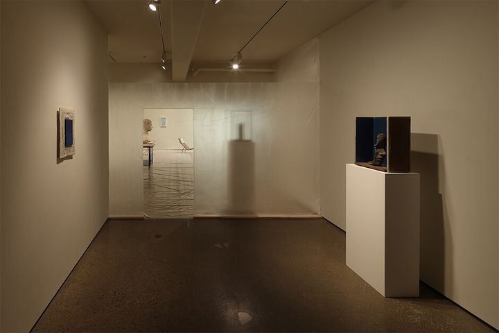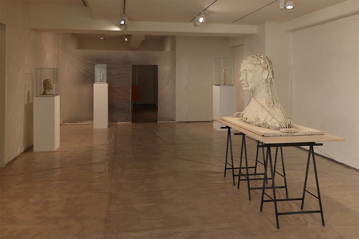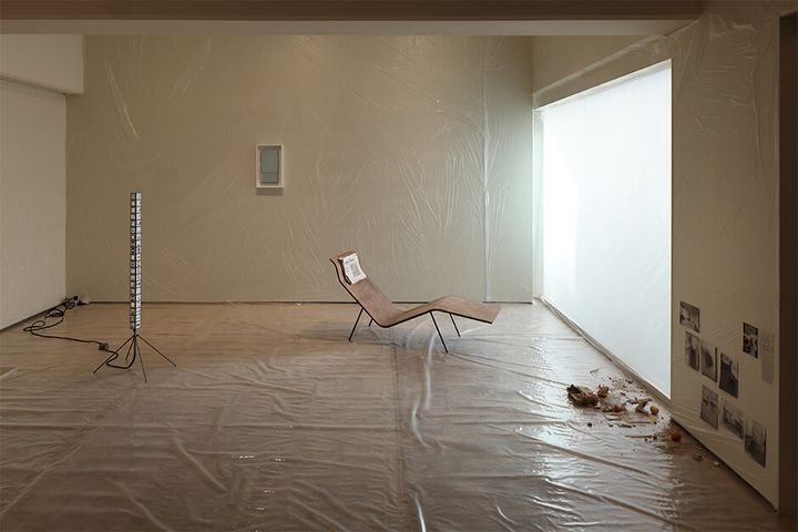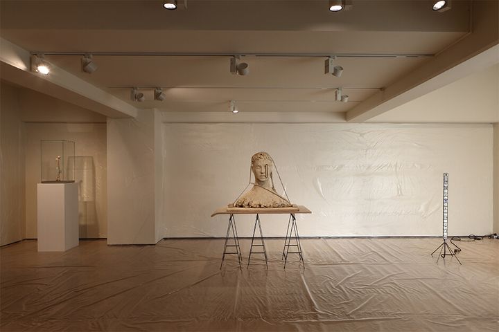 新作を含む9点を公開する本展では、ギャラリーの空間を半透明の薄いビニールで囲うことでアーティストのスタジオに一変させる。