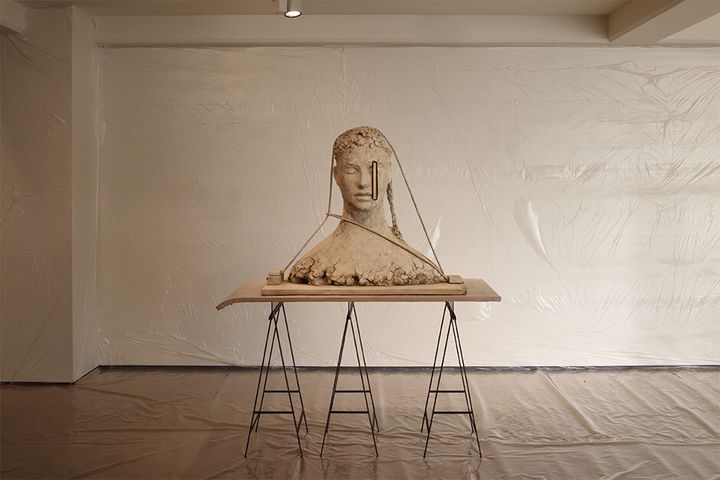 中央には「Bonewhite Clay Head with Two Ropes」(2018 - 2024)が配され、作業台の上にロープで留められた、乾燥してひび割れたかのような彫刻が今にも崩れそうな緊張感を与える。