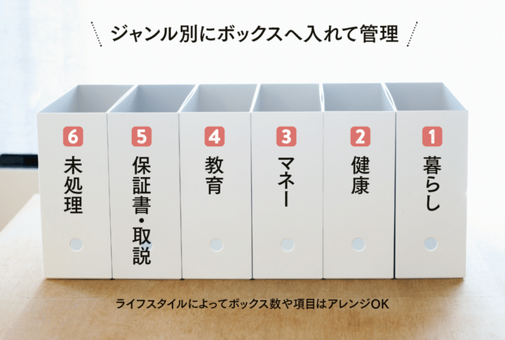 必要な紙を残したら、ジャンル別にファイルボックスに入れて管理します。