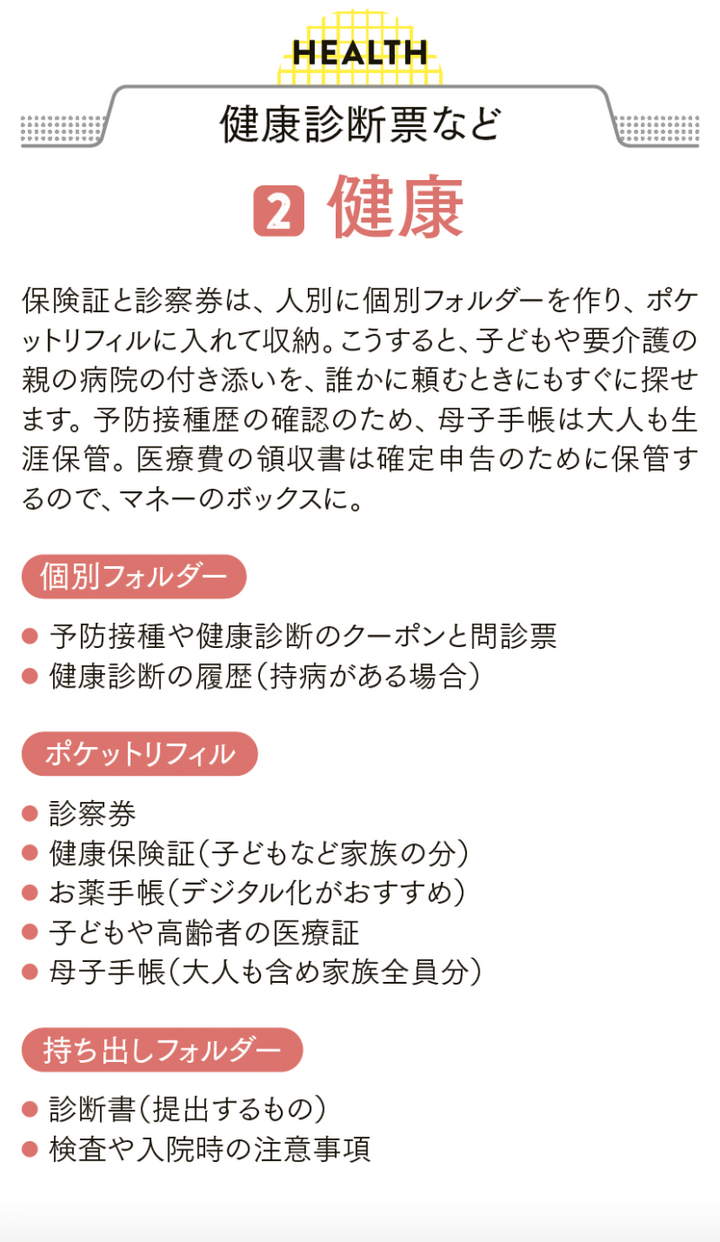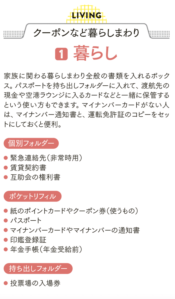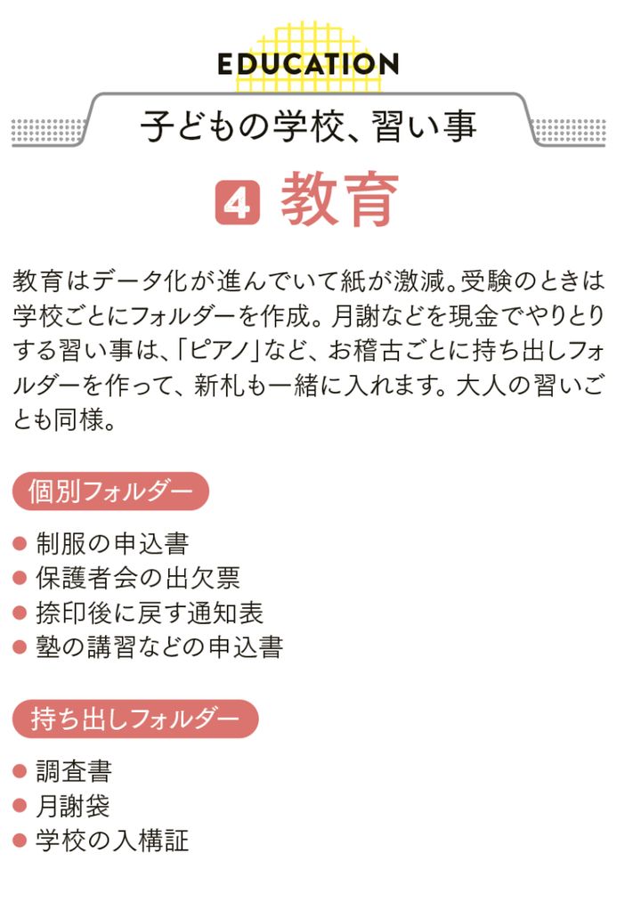 人によってそれぞれですが、上記以外にも入学願書や制服の申込用紙、月謝袋、学校などの入構証、紙のポイントカード、クーポンなど、それがないと手続きができない紙、なくすと支障がある紙をファイリングします。