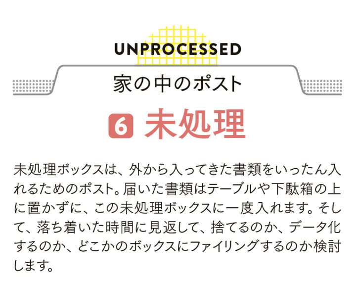 ただ、判断するには、書類の価値や意味を理解する必要があります。判断に時間がかかる場合は“未処理ボックス”に入れておけばOK。ただし、そこに何日も放置するのはNGです」。