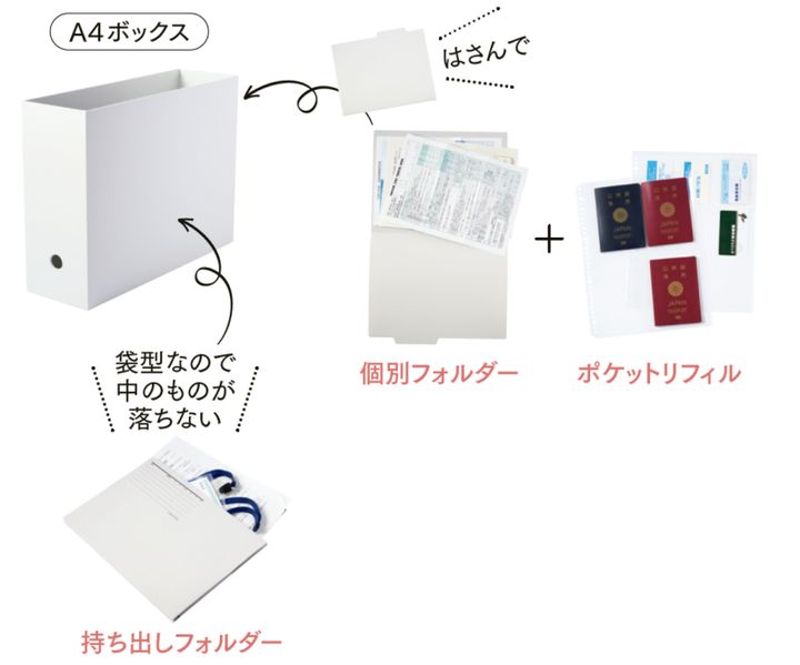 「紙は寝かせたら山積みになるので、立てて収納できるA4のファイルボックスを使います。ラベリングをしてリビングなど家族が手に取れる場所で管理をしましょう」