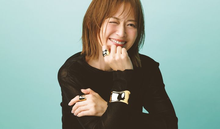 右手人差し指につけたリング「エルサ・ペレッティTMボーン リング」¥737,000左手人差し指につけたリング「エルサ・ペレッティTMスプリット リング」¥687,500バングル「エルサ・ペレッティTMボーン カフ」¥2,915,000(すべてティファニー/ティファニー・アンド・カンパニー・ジャパン・インク)トップス¥20,900(アナイ)